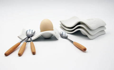 Type A: 4 wavy egg cups and 4 stainless steel spoons with wooden handles!